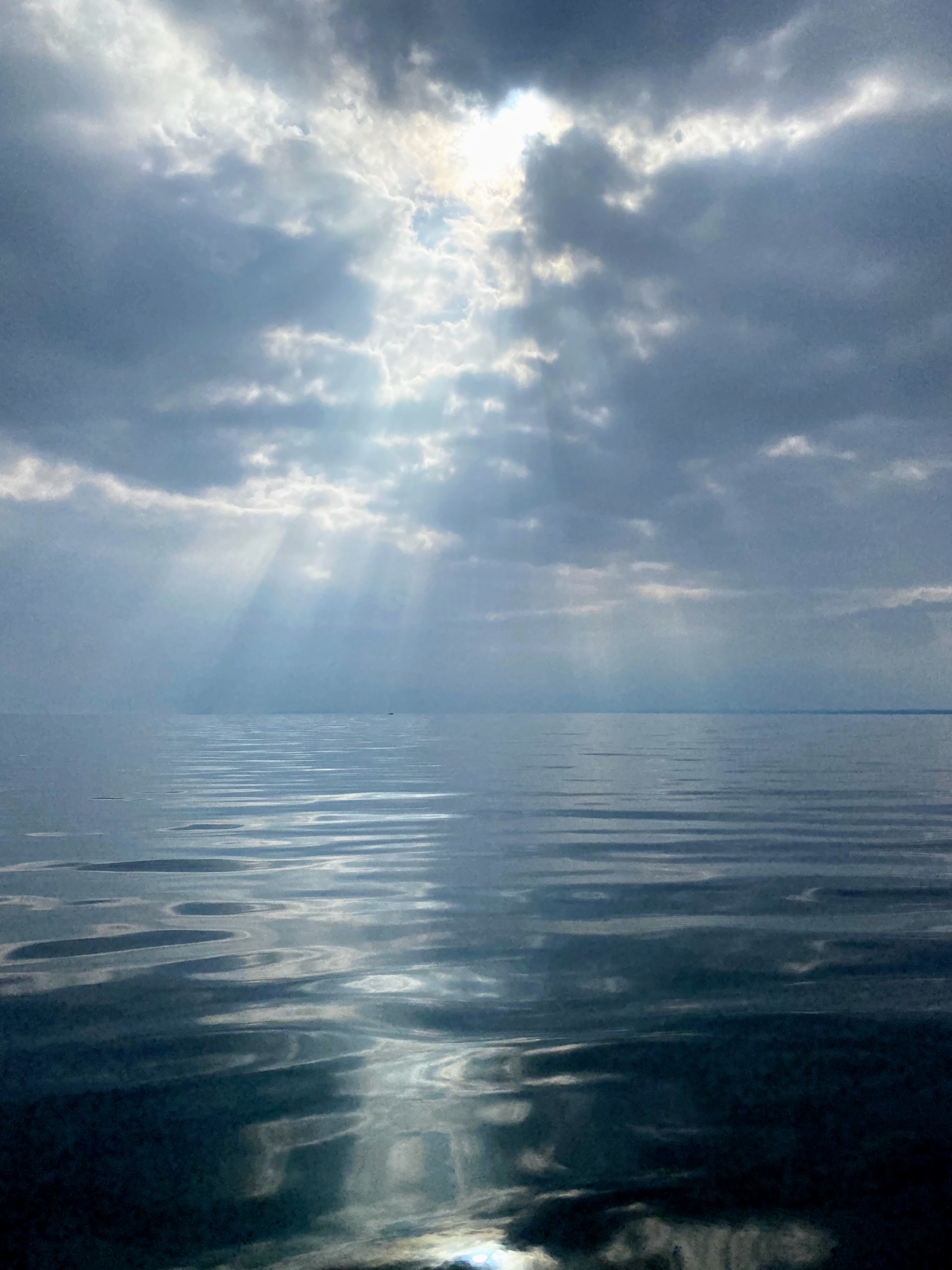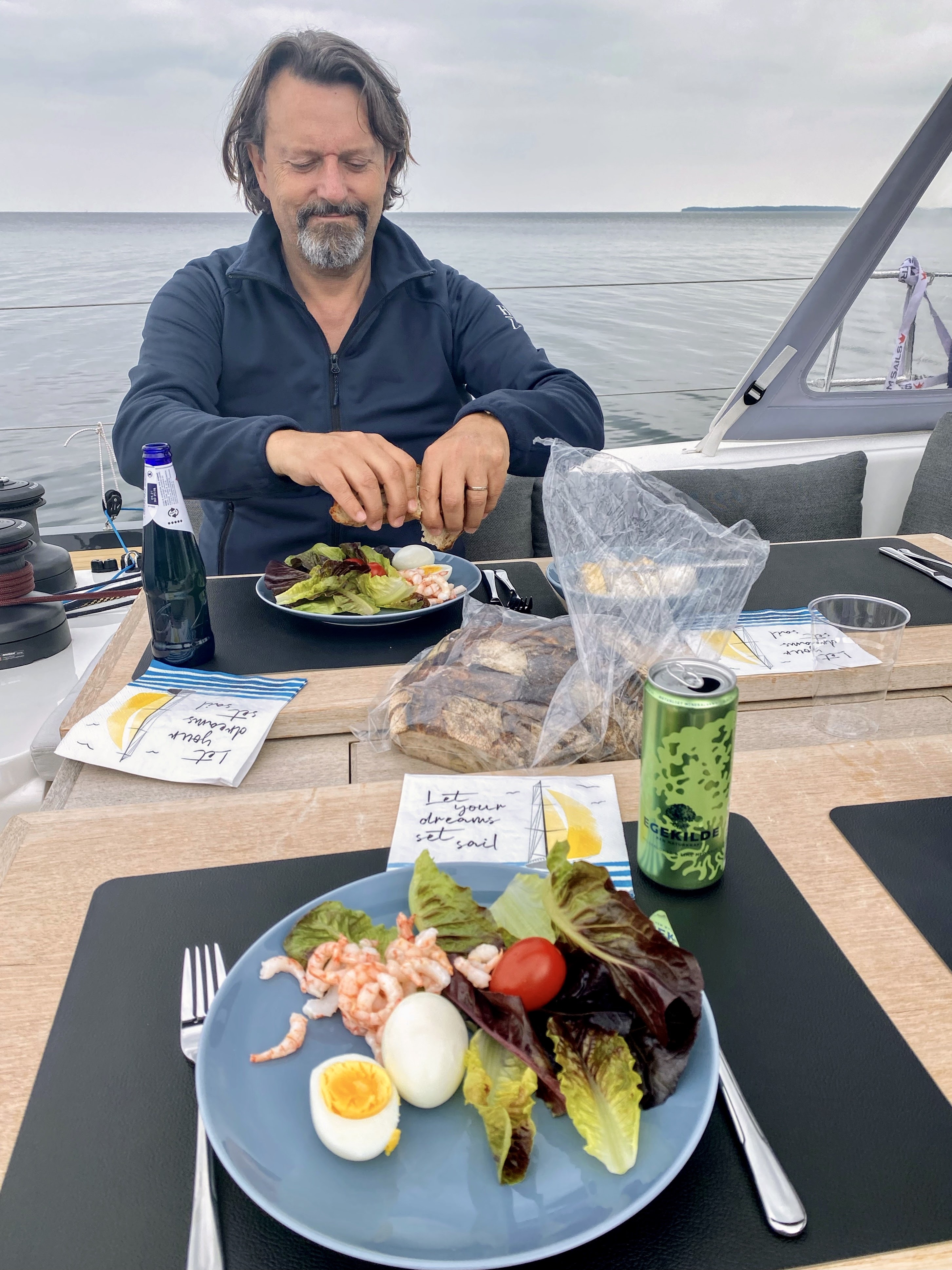 We ate a lovely lunch in the cockpit — boiled eggs and shrimps, fresh lettuce and tomatoes, olive bread from La Cabra and hummus. Took a nap — some in the cabin, others in the cockpit. Read the weekend paper. Talked about the other boats passing by or dropping their anchor near us. As you do.