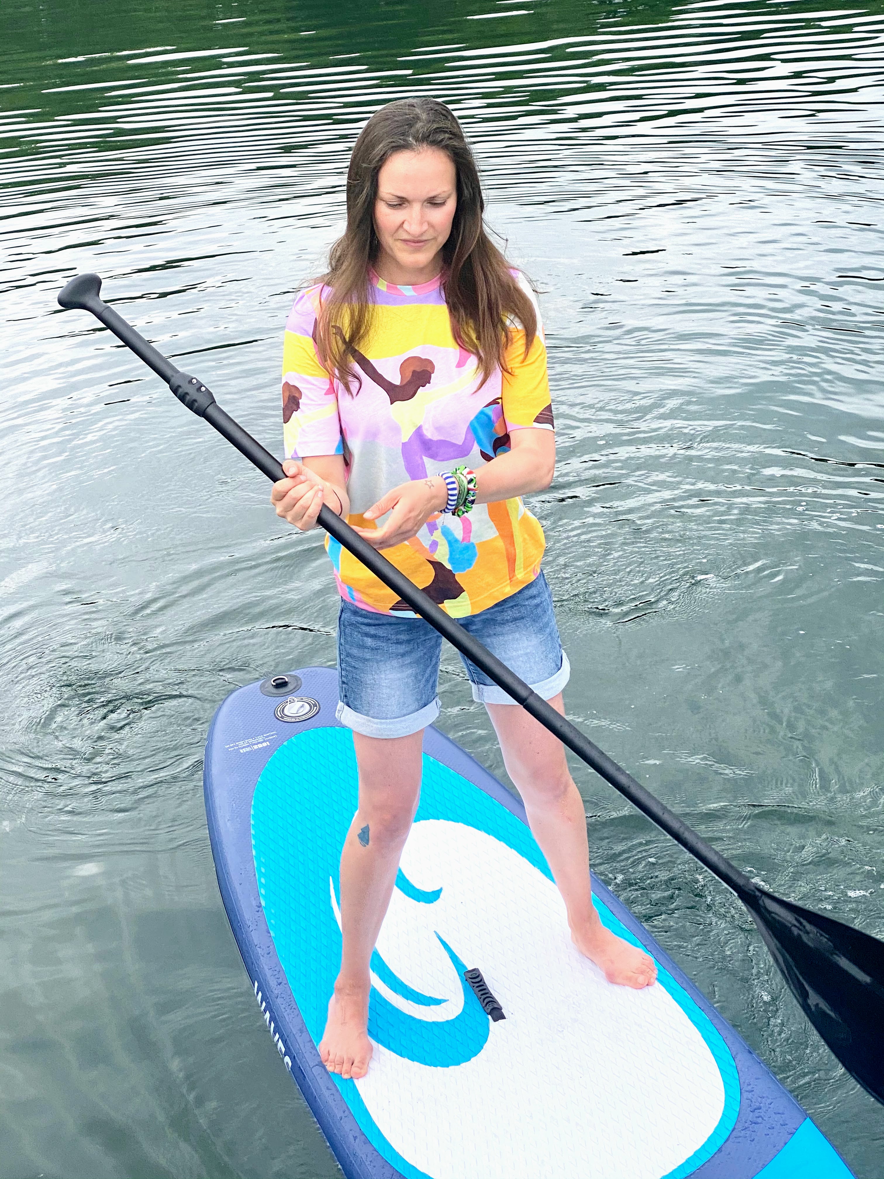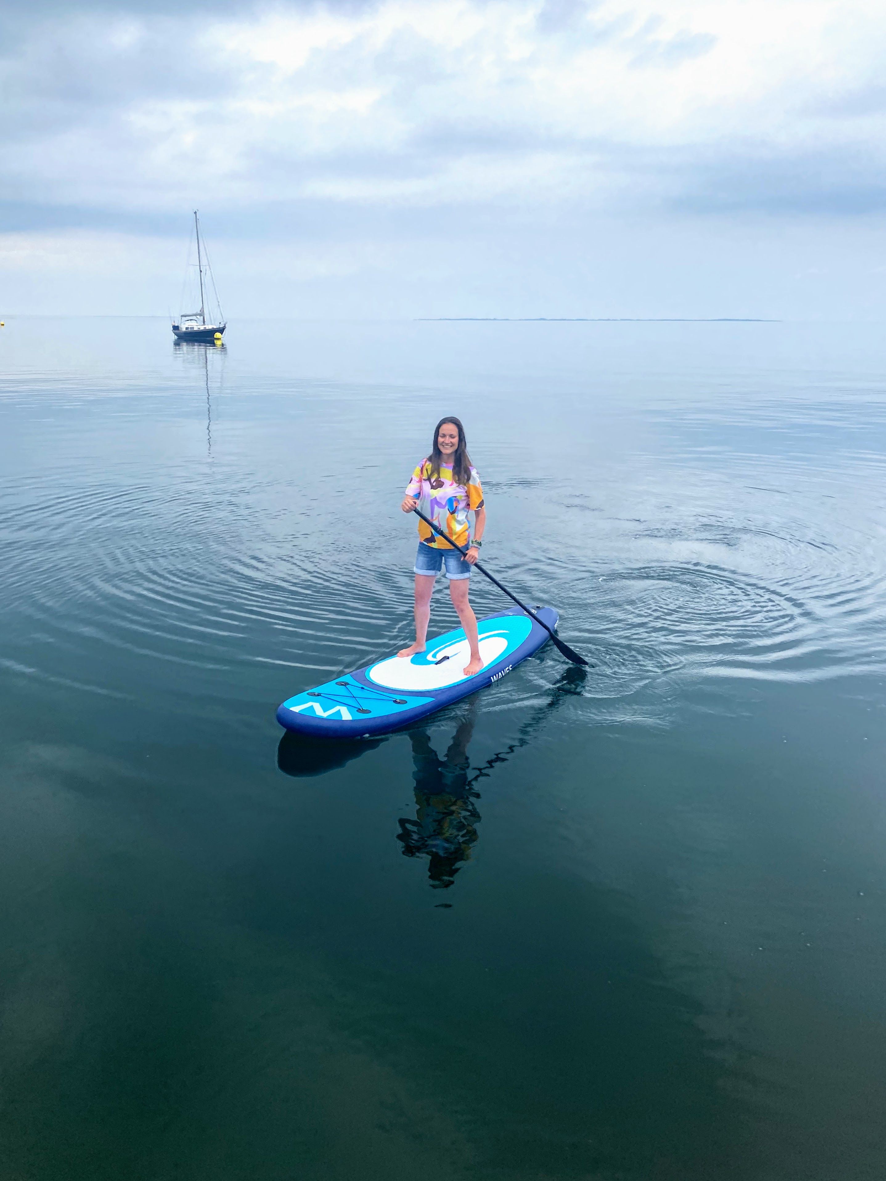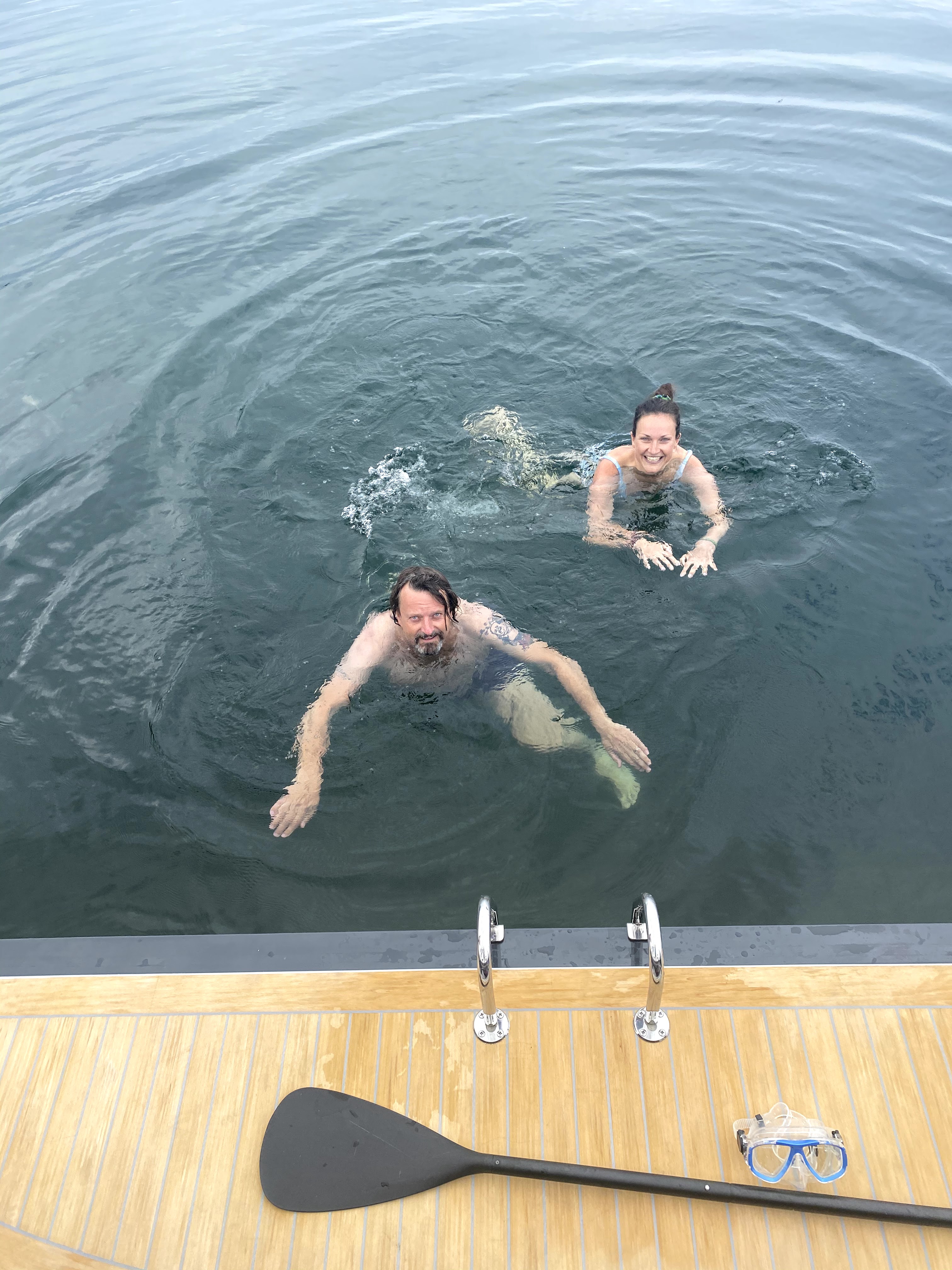 My dad and I then launched the SUP into the water, and I circled the boat on the board 3-4 times to get the hang of it again, and then made my way towards the shore of the island. The colours were amazing — the brown and green shades of the cliffs and vegetation, the clear, clean sea, the white pebbles on the sand floor, and the way the colour palette of the island, the sky, and the sun were dancing in the water. I went back and forth along the coast, slowly, with long, slow paddle strokes, chatting to our fellow anchored sailors and a few fishermen. After a while, my dad took over the board to practice his paddling. Eventually we both jumped into the water and swam around the boat and to the beach and back. So refreshing!