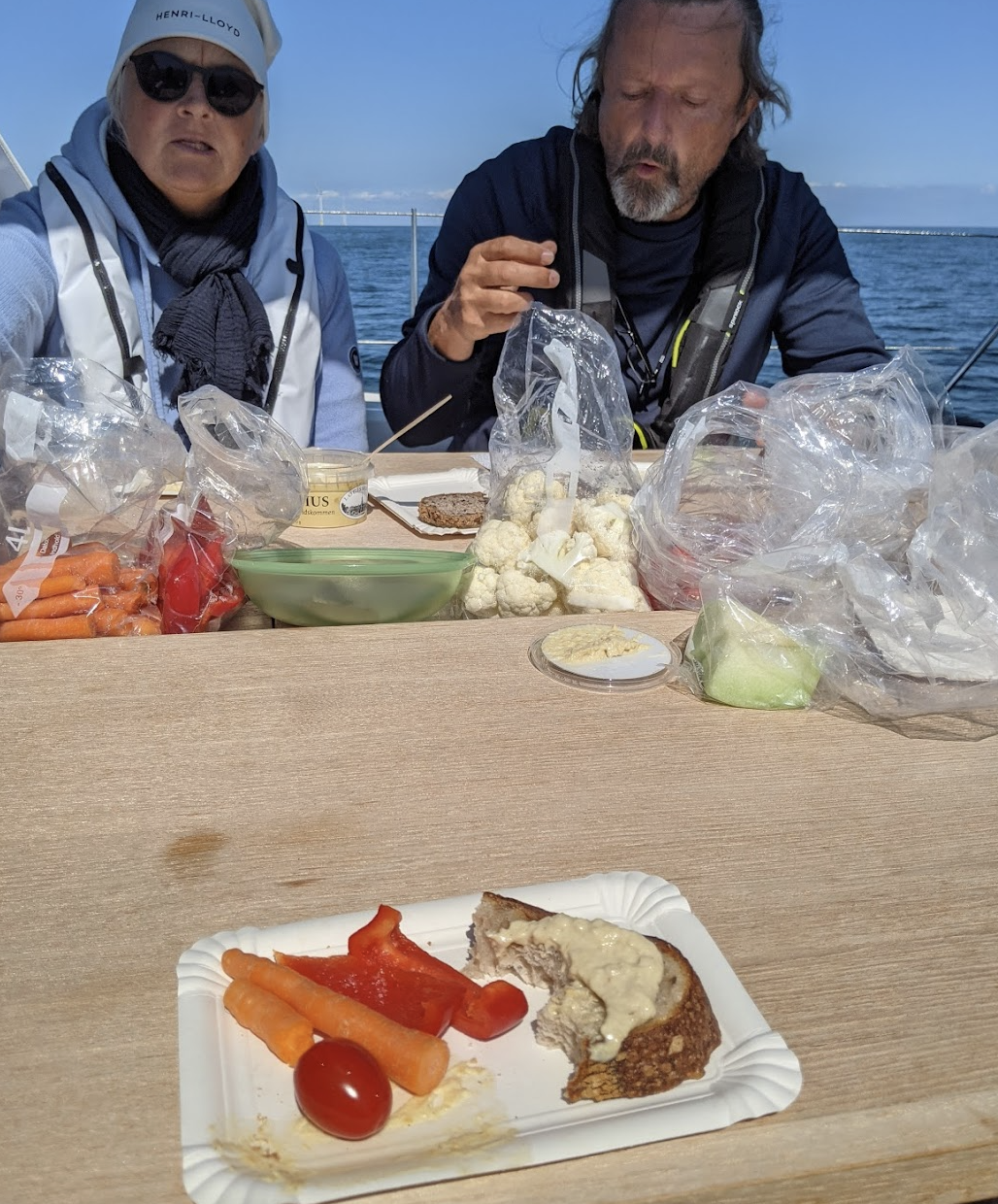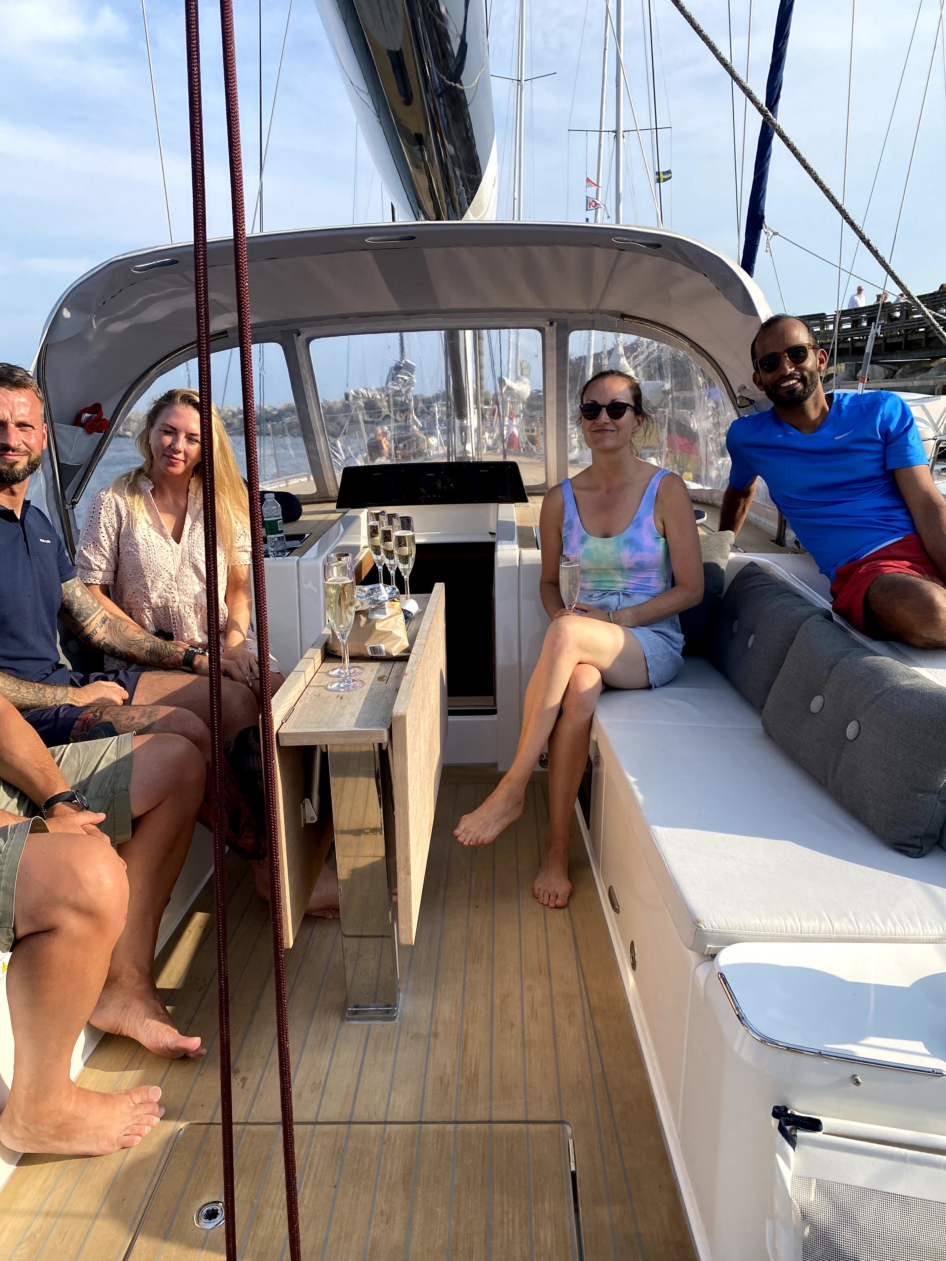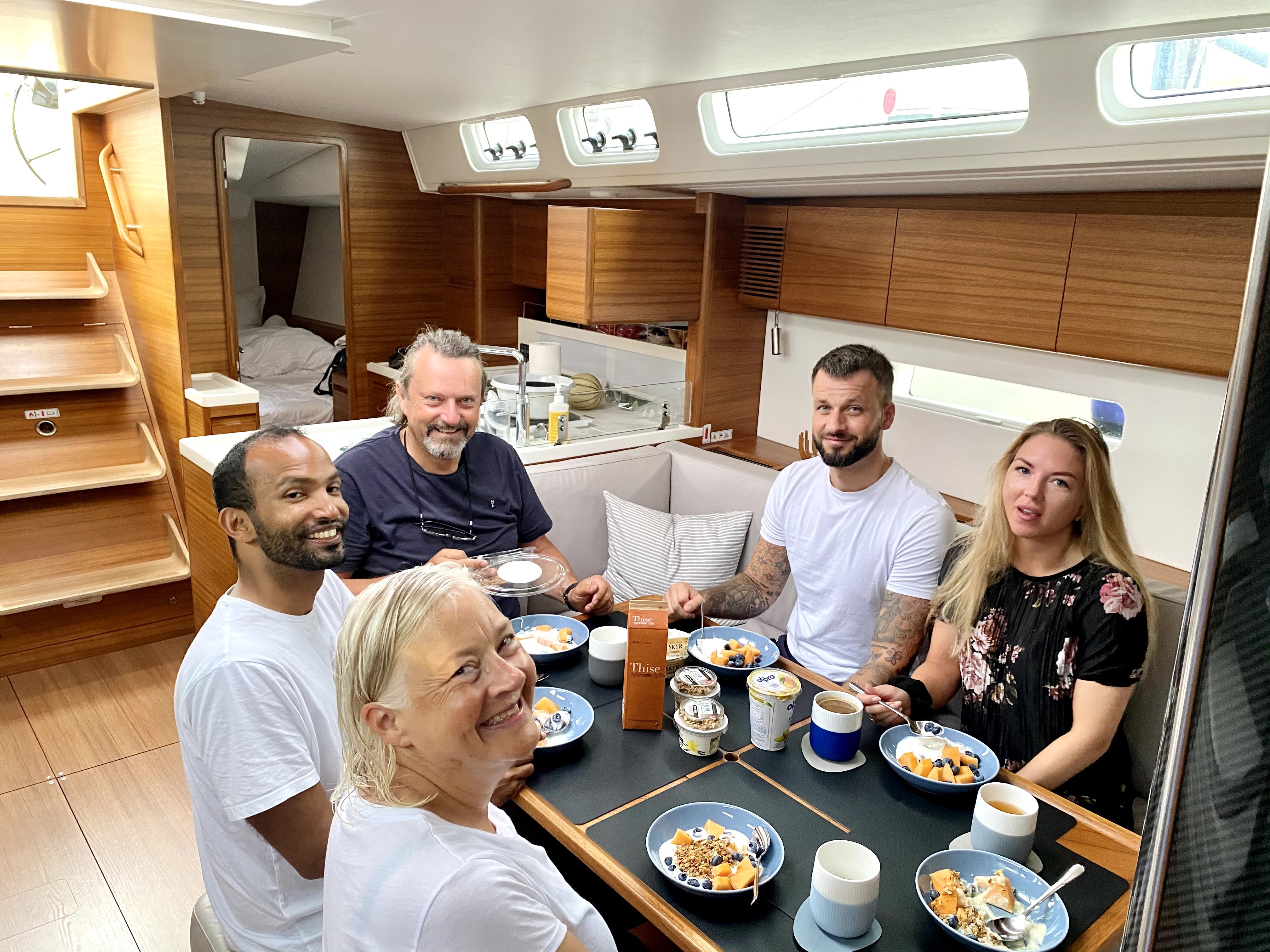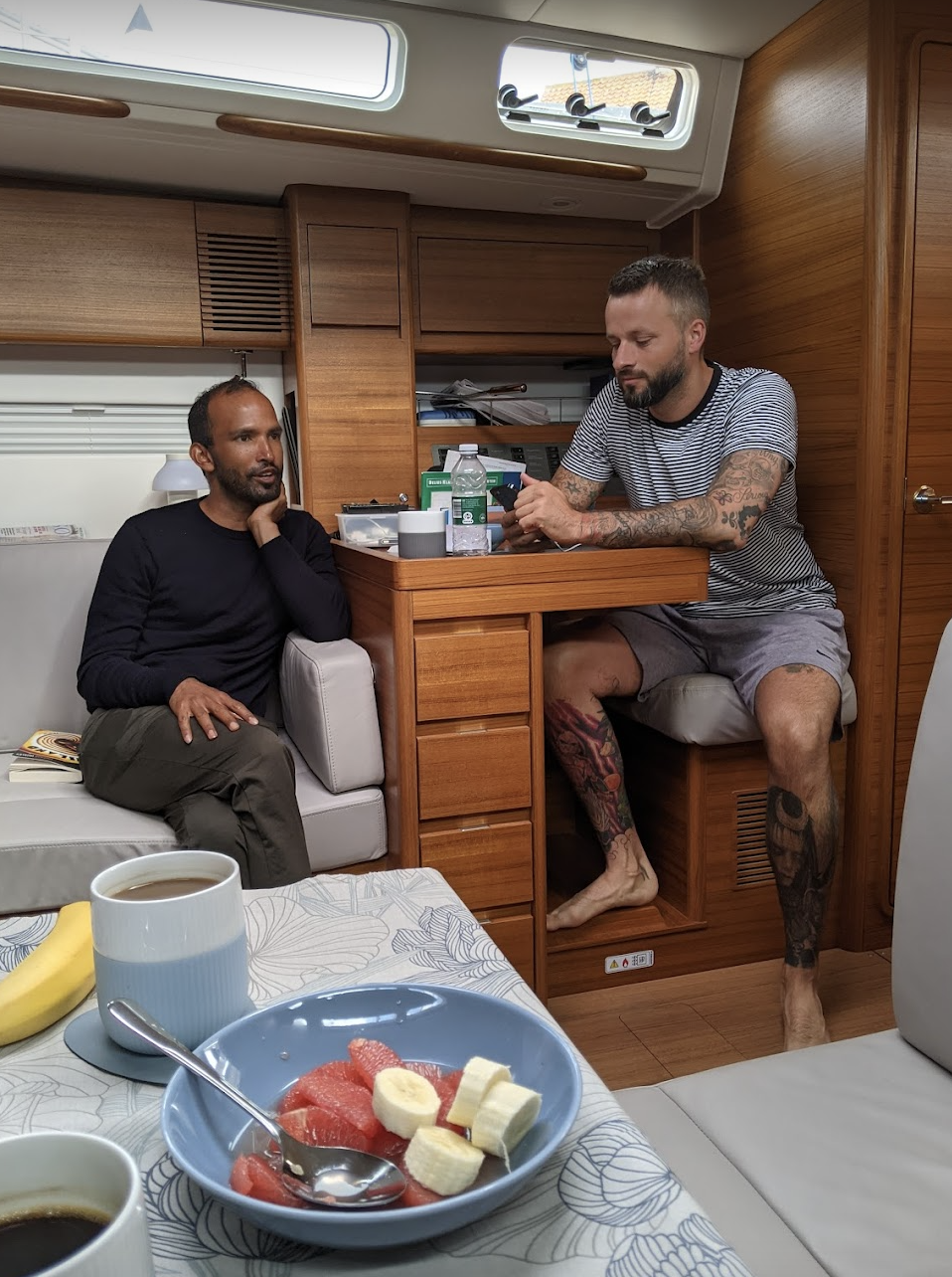- On Sunday evening, Christian and Katrine arrived and settled in. C&K’s cabin is below the left side of the cockpit, Sanoop’s and mine is below the right side of the cockpit, while my parents’ is located towards the front of the boat. With 6 adults onboard, De Gæ Nok is at a comfortable-to-full capacity, and it suddenly becomes very clear how important it is to respect that every single item onboard is there for a reason, with a specific purpose and a designated home. It’s a spacious boat: but it’s still a boat. Every crew member has a responsibility towards each other to be on their best, most emphatic, most patient, and friendliest behaviour. Believe in each other’s best intentions. It’s a healthy exercise for any family. It felt cosy and exciting — and as a huge privilege in a time of much distance and challenge — to be together all of us. On that first night of the trip, we had a skipper meeting and dinner at a nearby restaurant.