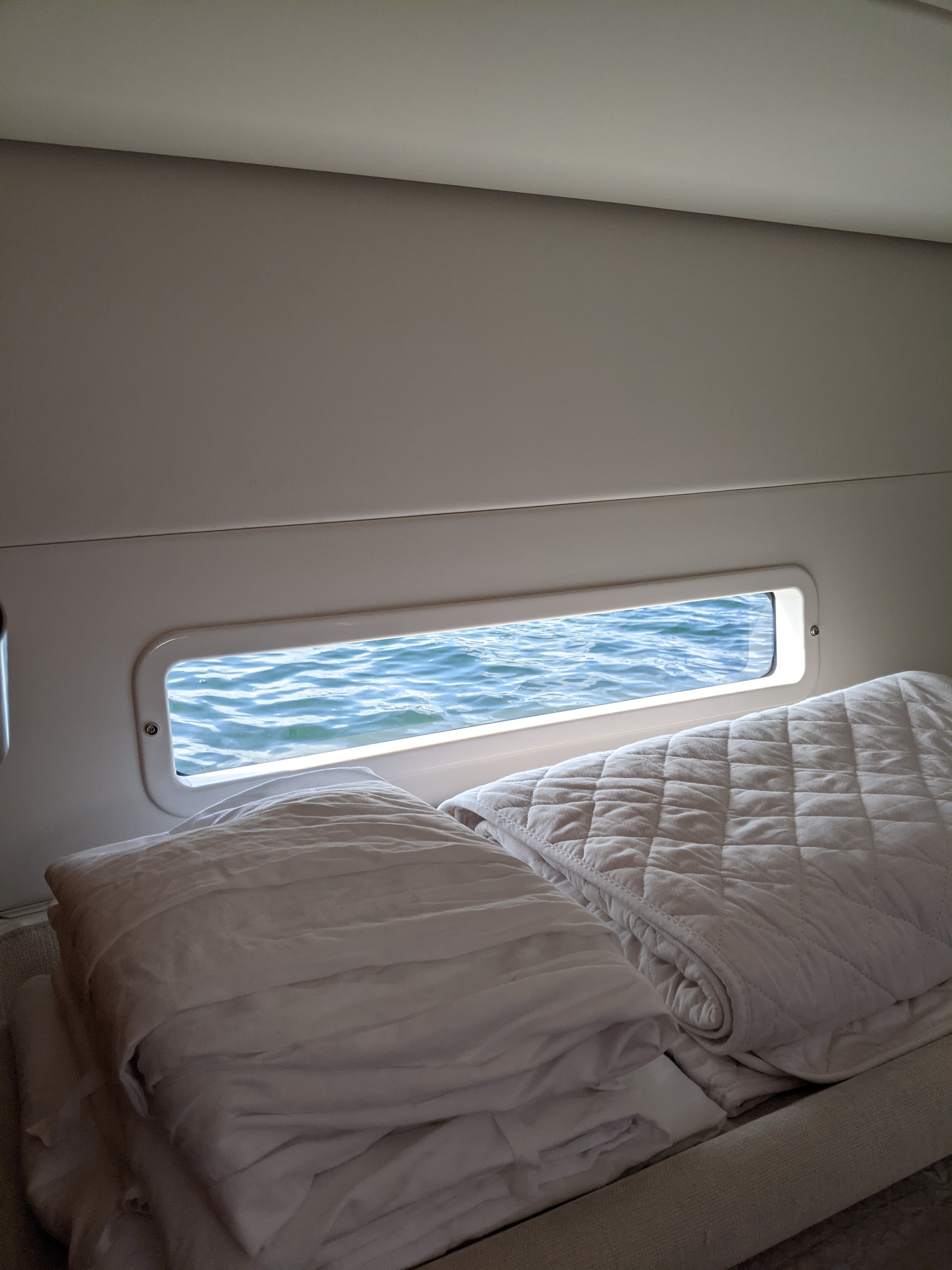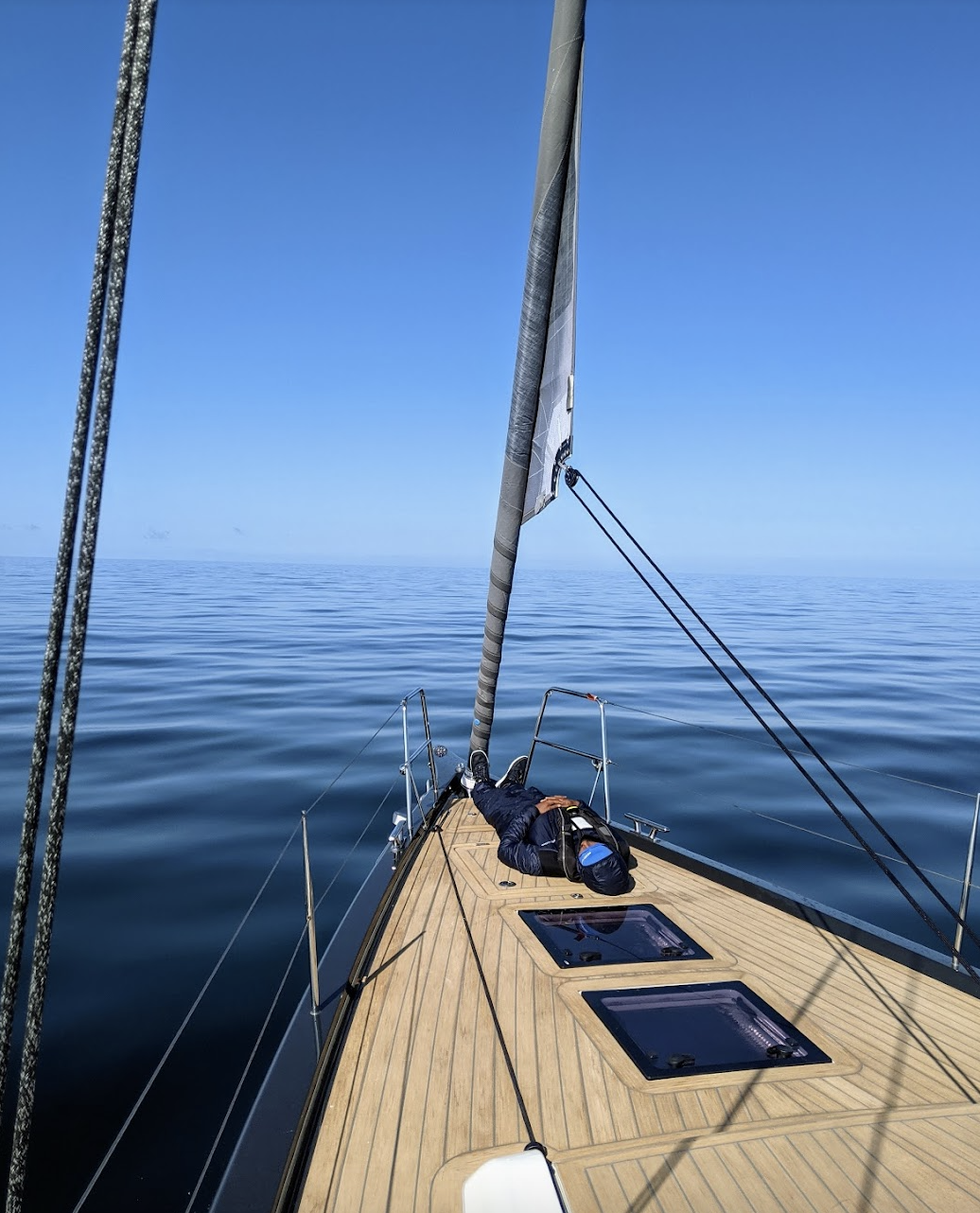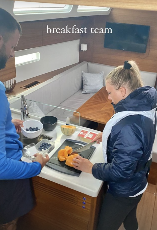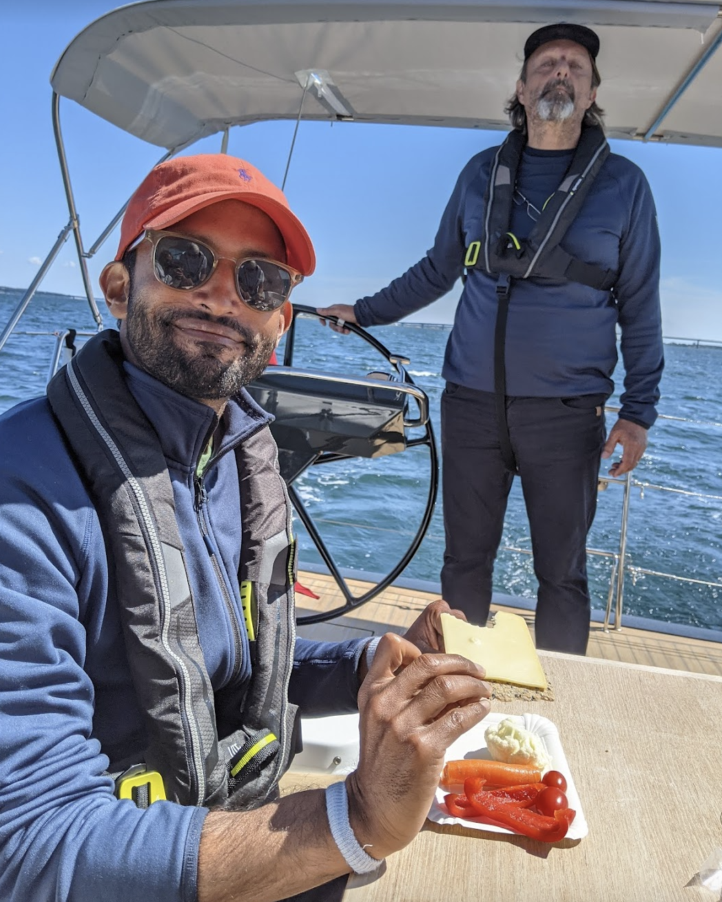 - On Sunday evening, Christian and Katrine arrived and settled in. C&K’s cabin is below the left side of the cockpit, Sanoop’s and mine is below the right side of the cockpit, while my parents’ is located towards the front of the boat. With 6 adults onboard, De Gæ Nok is at a comfortable-to-full capacity, and it suddenly becomes very clear how important it is to respect that every single item onboard is there for a reason, with a specific purpose and a designated home. It’s a spacious boat: but it’s still a boat. Every crew member has a responsibility towards each other to be on their best, most emphatic, most patient, and friendliest behaviour. Believe in each other’s best intentions. It’s a healthy exercise for any family. It felt cosy and exciting — and as a huge privilege in a time of much distance and challenge — to be together all of us. On that first night of the trip, we had a skipper meeting and dinner at a nearby restaurant.
