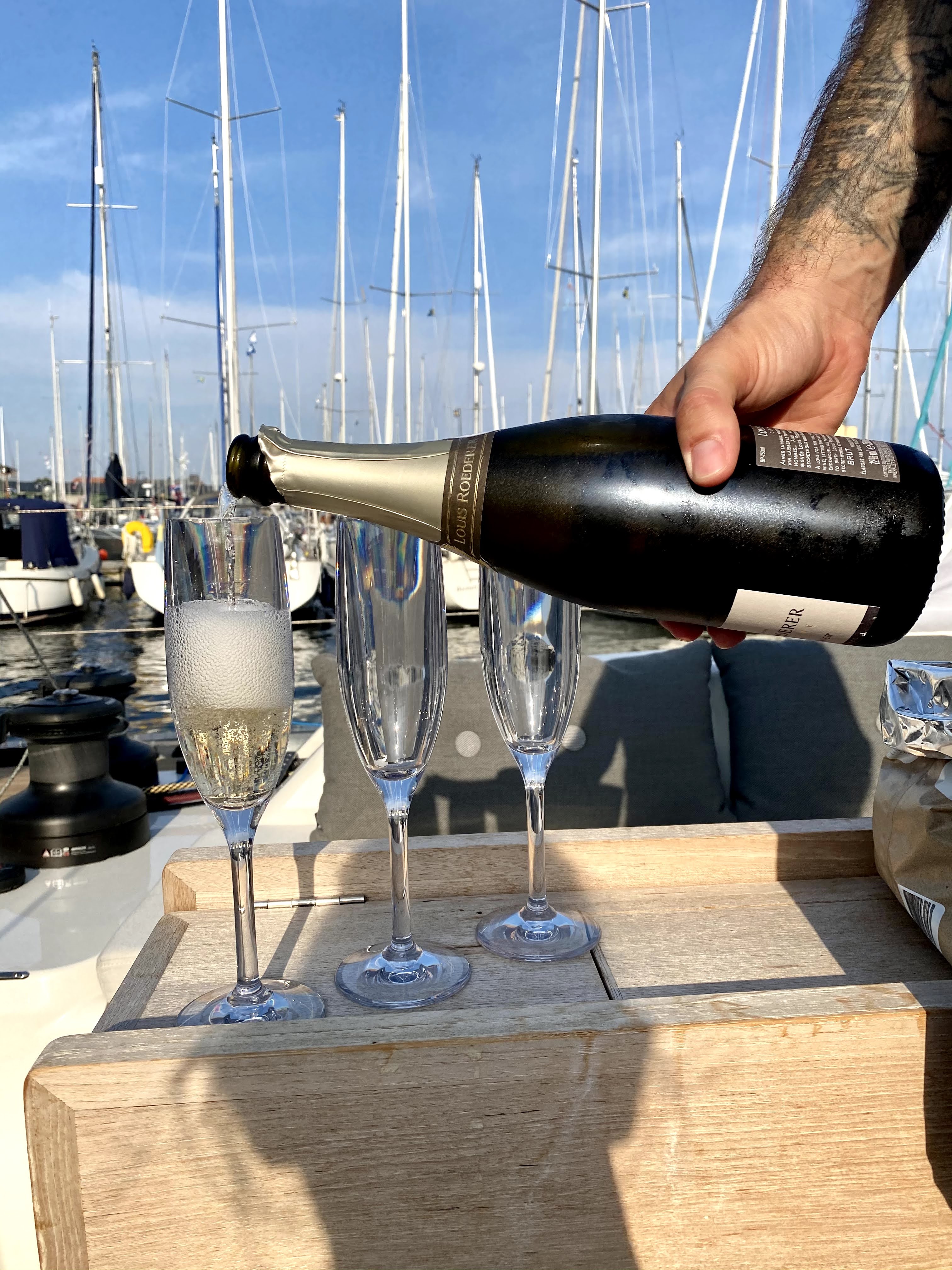 - We arrived into the cosy marina towards evening, mooring right next to the beach. Celebrated with an ‘Anliegerbier’ (mooring beer, in German), which has become our name for any drink we might drink upon a successful mooring: gin/tonics, red wine, sodas, sparkling water … in this case, champagne.