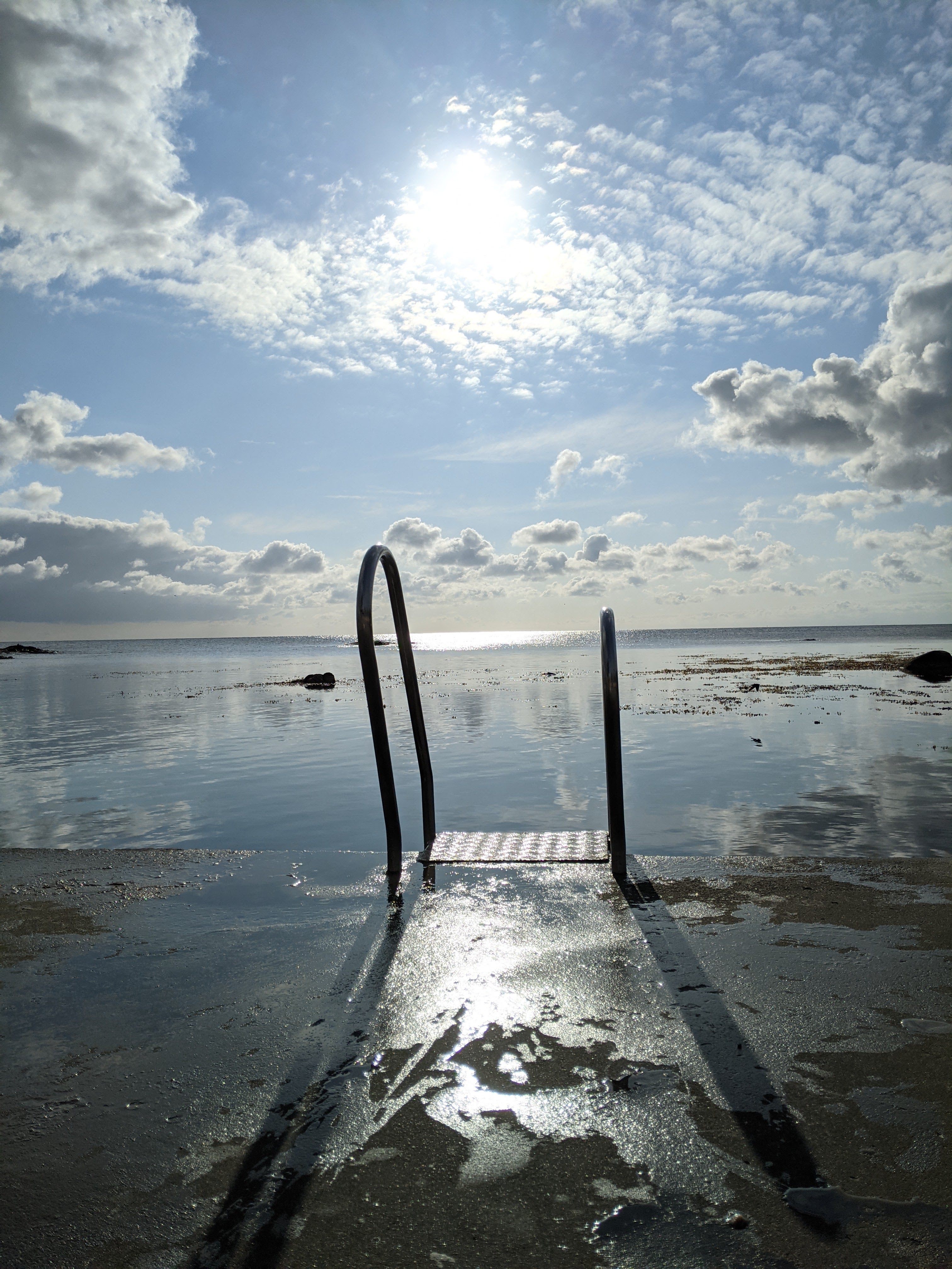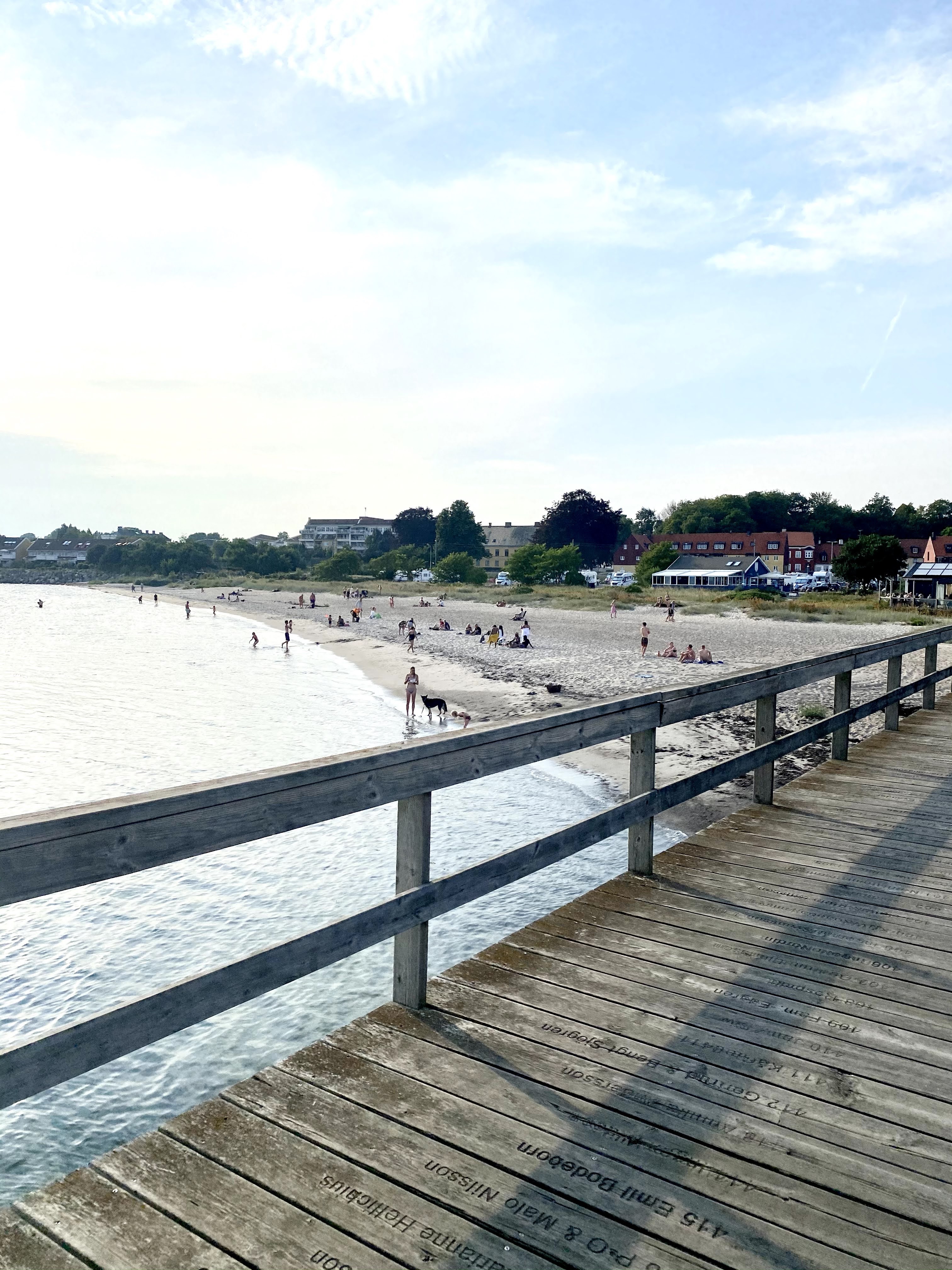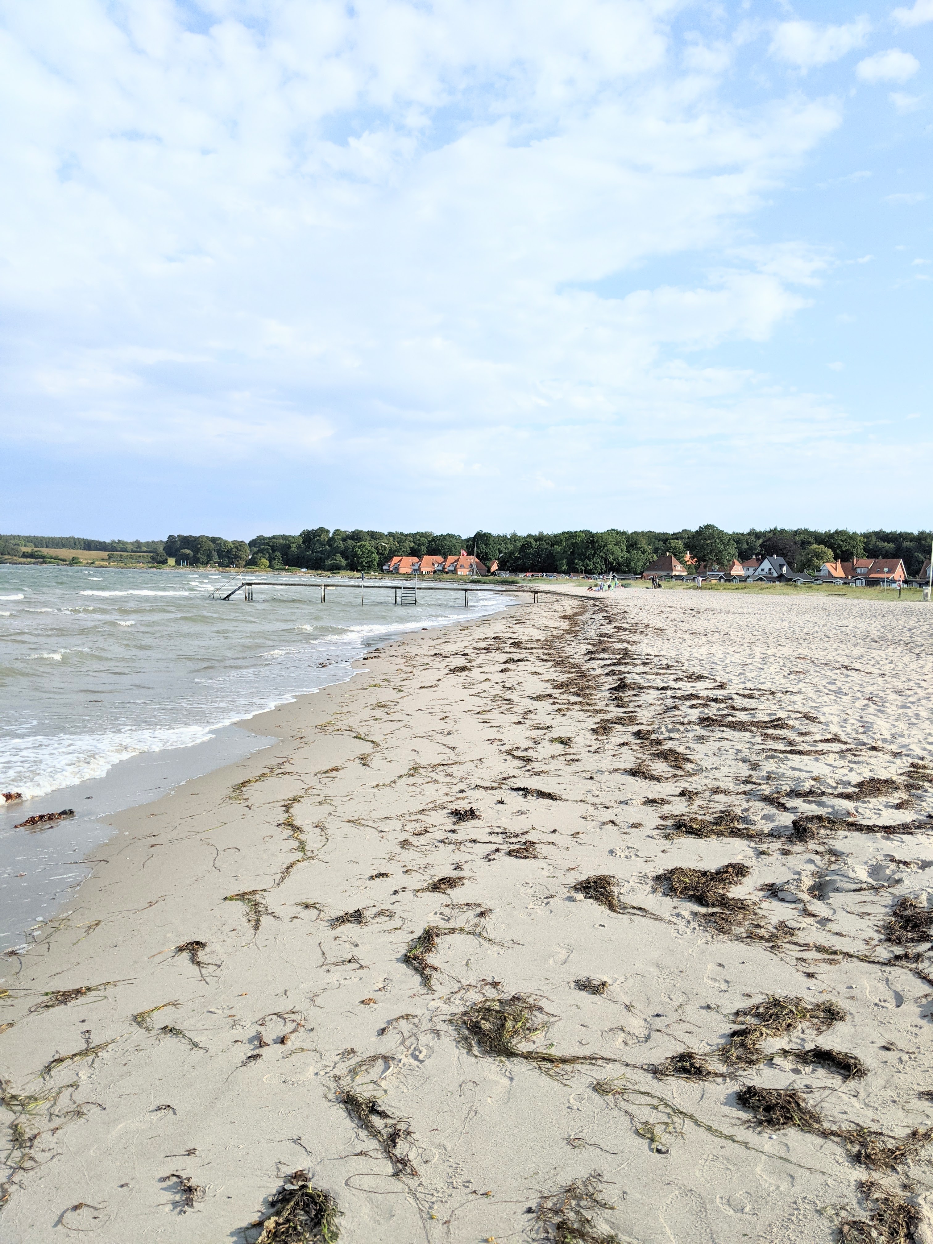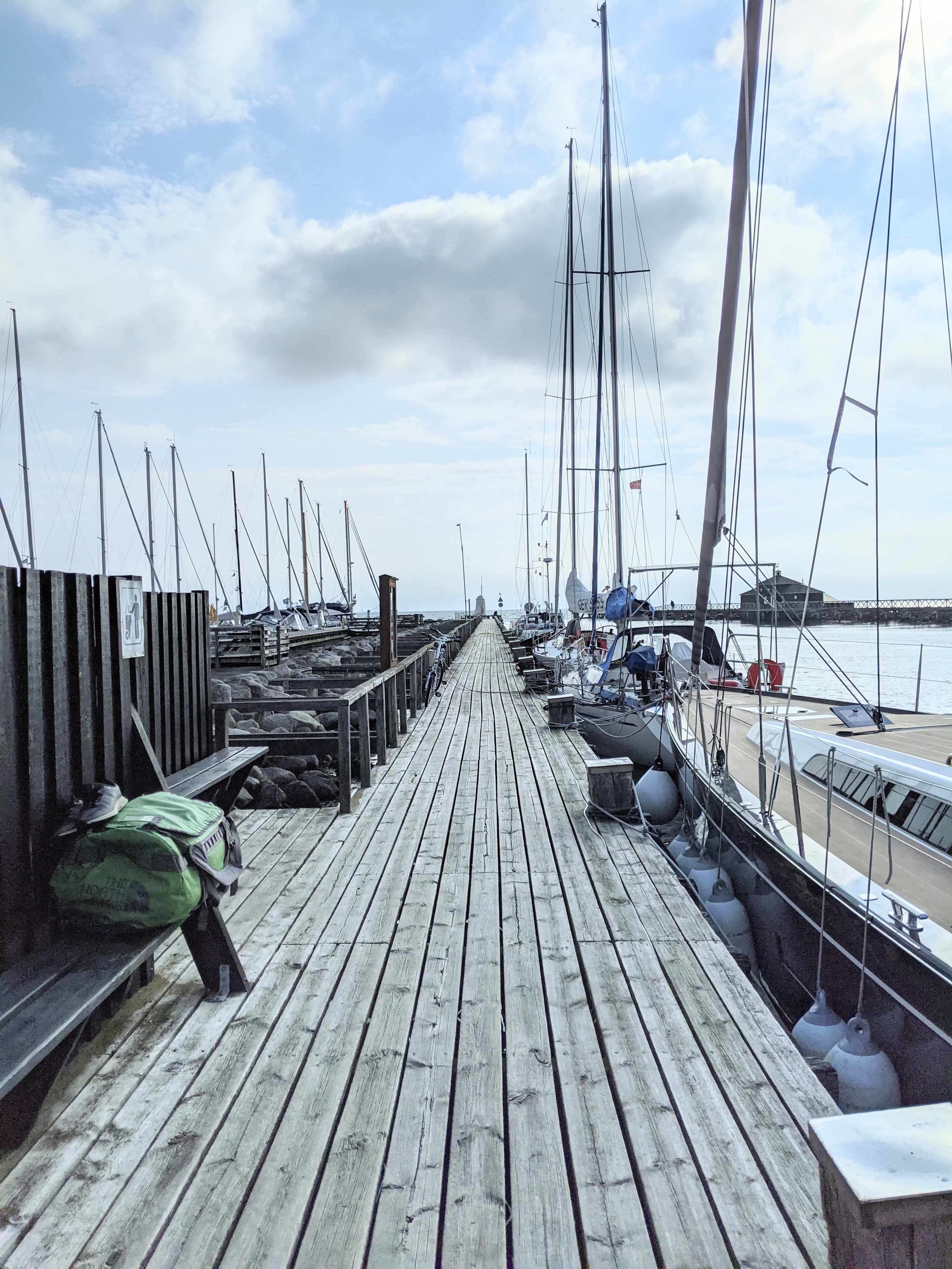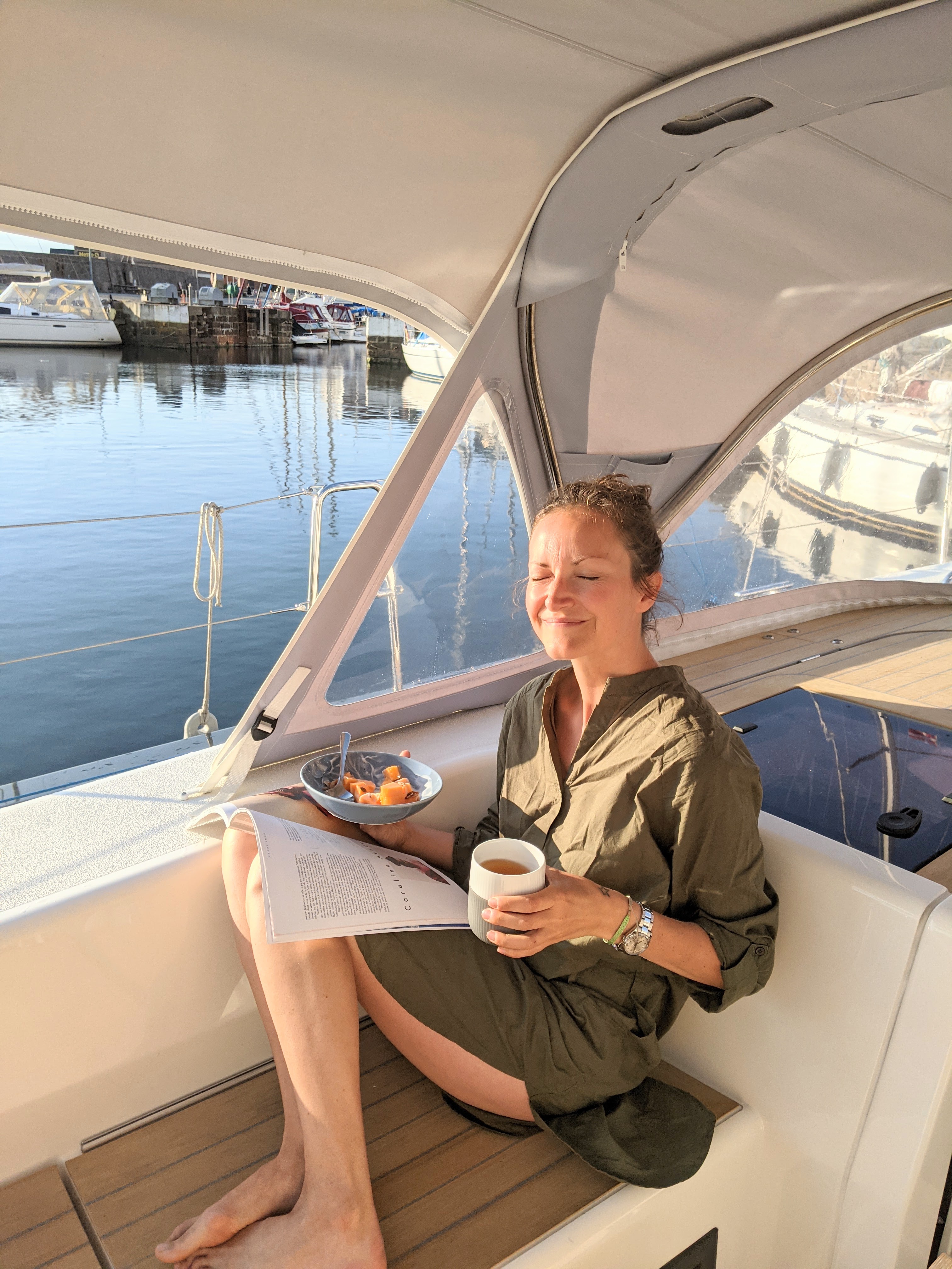 - Each morning, I’d walk to the beach along a sandy path winding its way between patches of heather and pieces of cliffs, lined, to the right, with quaint spa hotels and half-timbered summerhouses. The light was brightly yellow. The sea, on my left-hand side, was a clear, shiny blue mixed with a luminous green from thousands of slimy bands of seaweed. Kids were playing on the rocks and in the water. A local swim club met each morning, at 7:30am, right where the path and the rocks meet a small patch of white sand; the beach. I exchanged smiles and good morning greetings with everybody, and jumped into the cool, clean water. Swam around for 10-20 minutes. Got out and dried up in the cliffs. Walked back to the marina feeling fresh. Took a quick shower in the public shower facilities. Joined my family for tea, coffee, and breakfast onboard. I’d then sit in the cockpit for a bit, enjoying the sun and reading, do some yoga on the deck, and take my SUP out for a slow paddle back and forth in the marina. You’re not really supposed to do paddle in small marinas, but when I called the harbour master to check what he thought, he said that he couldn’t tell me not to, and that it would probably be all right as long as I took care and steered clear of moving boats.