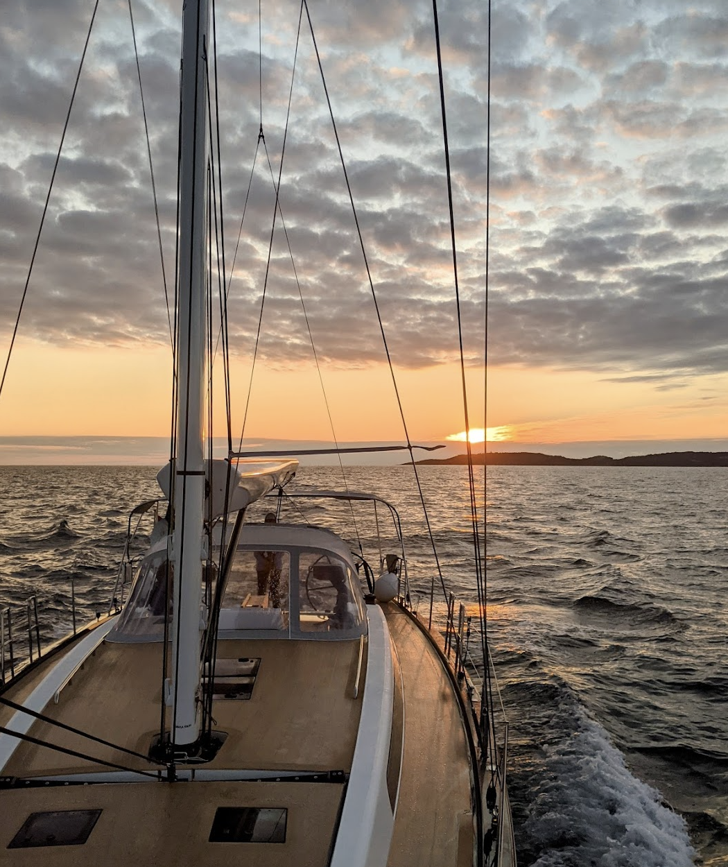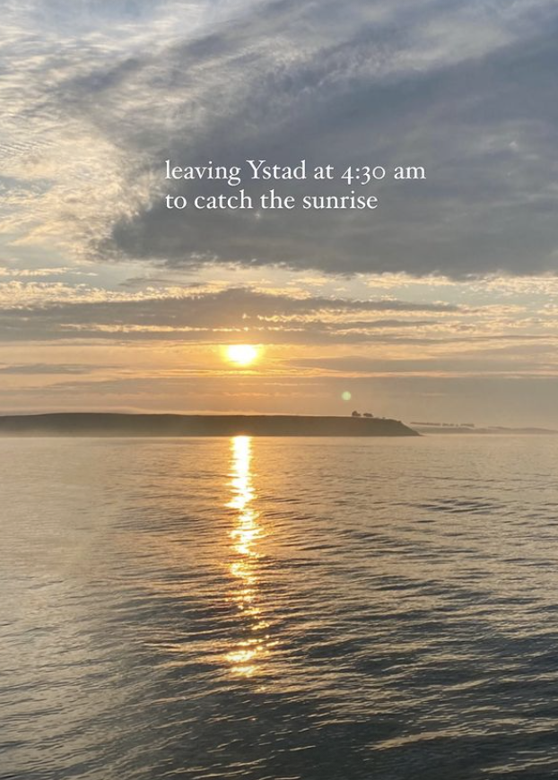 - We left Ystad at 4:30am, when the port was still quietly asleep, sailing out into a totally serene world of glassy water, pastel-coloured sky, and faraway, mist-covered coastline. When the sun broke free of the rocky southern coast of Sweden, we all felt a swell of emotion and a few tears trickling down our sleepy faces: it was so beautiful. My favourite people standing together in the cockpit of our wonderful boat, coffee cups in hand, gazes fixed on the golden horizon, while we were slowly gliding west towards the fairytale island of Bornholm. My brother even managed to turn up the volume on the atmosphere a little bit further, quite literally, by putting on the perfect soundtrack: a medley of Enya (The Lord of the Rings soundtrack), grave Viking melodies, Denmark’s girls’ choir’s classic tunes, and Anne Linnet and Alberte Winding’s summer- and morning-praising ballads.