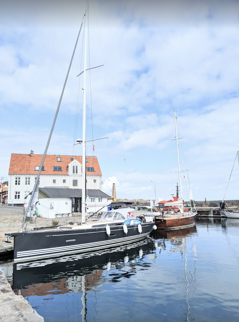 - Allinge Marina, near the northeastern tip of the island, is a small, cosy nook situated at the centre of town. Small boutiques, cafes, and art galleries are dotted along the quay. Nationally renowned artists perform at Gæsten, an open-air music venue just a few streets from the waterfront, throughout the summer season. Jazz tunes can be heard from other small venues across town. In one of the cute cobbled streets, we found a chocolate boutique whose owners run a chocolate farm in Fiji. Some local residents sold cups of freshly picked ripe mirabelle plums from stalls set up in front of their gardens. Most of the bars and restaurants in Allinge are plastered with satirical political posters: the town is perhaps most famous for its annual national political festival. The beach is a short walk to the south. A rocky nature path leads north towards the other cosy town of Sandvig and the castle ruin, Hammershus. Traditional seafood smoke houses mark the southern and northern ends of the marina. The marina itself was pretty full all of the week we were there — our seafaring neighbours had arrived from Denmark, Poland, and Sweden. Everybody seemed friendly; most were calm. One Swedish boat next to us took care of a good chunk of our daily entertainment: its crew was a festive bunch of elderly party animals, drinking heavily, singing cheerfully, dancing dramatically around their tiny cockpit (we were constantly afraid they’d fall overboard). As they caused no harm (to us nor themselves) and didn’t disturb us too much, we merely regarded them as the type of people who bring a bit of character and edge to a marina. Allinge was altogether a great starting point for exploring the island. We quickly settled into ‘island pace’, took everything pretty slowly, exploring a few bits a day, with plenty of time left to chill. The weather was fairly pleasant all week: super windy, but sunny and warm.