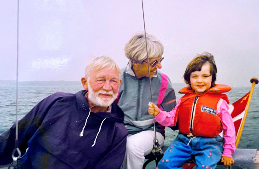 A child during the war, she grew up with a fascinating German mother, a Danish father, who was part of the resistance movement, and a half-brother, who was forced by the German government to fight on their side of the war. She loved sports. In 1947, she and my grandad bought their first sail boat together, a wooden dinghy in which they spent their honeymoon, and went on to sail together for circa 60 years, accumulating countless friends and adventures on the waves. My grandad had type 1 diabetes: she’d boil his glass insulin syringes on jetties across the country. Their mantra was, De gæ nok (it’ll work out!). My first summer was spent on board their boat, and throughout the ‘90s, my brother and I enjoyed lots of adventures on the water and in marinas with them. They both were amazingly present, engaged, and inspiring grandparents till the end. A constant in our lives.